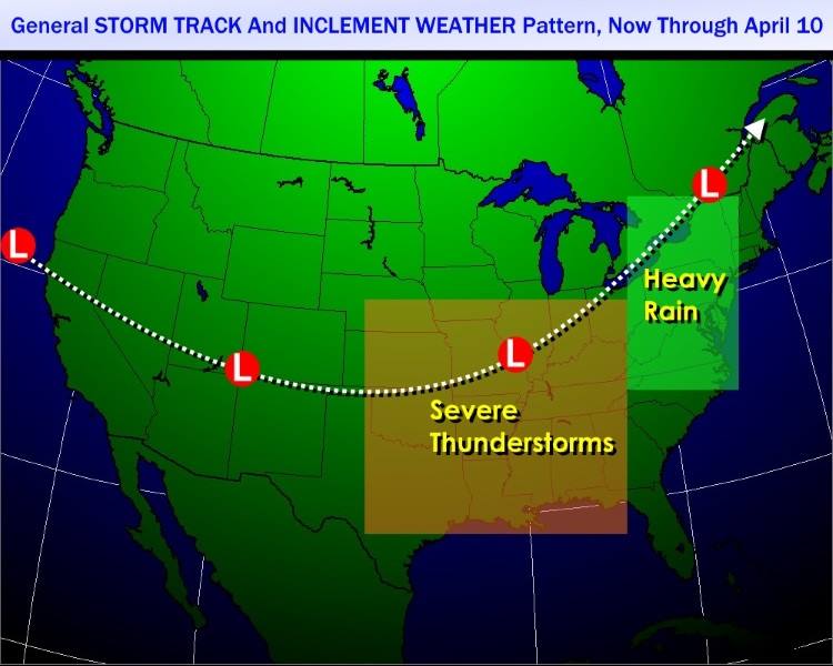 Spring is looking very active and stormy. With a very active jet stream, temperatures should be above normal in general, although late frosts remain possible in such a pattern. An active spring weather pattern favors severe weather.